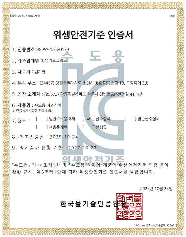 💧지오그리드, 수도용 여과장치 위생안전기준(KC) 인증 획득